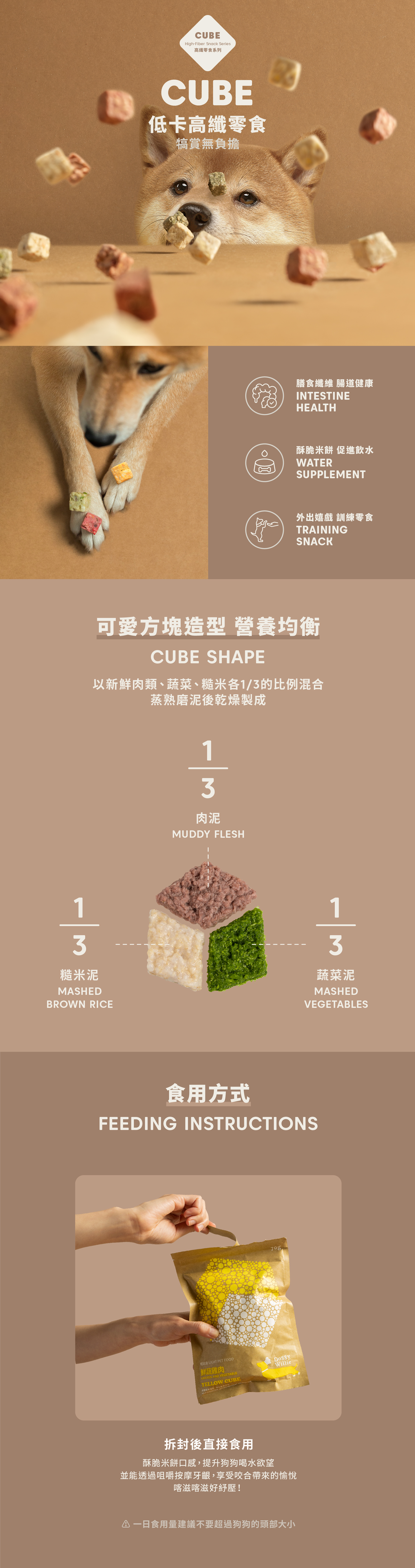 以新鮮肉類、蔬菜、糙米各1/3的比例混合,蒸熟磨泥後乾燥製成。可愛立方體造型不只體現飲食平衡的概念,更讓毛孩食用增添趣味。方塊上的微小氣孔更易消化,豐富膳食纖維促進腸道健康。酥脆米餅口感提升狗狗喝水的慾望,並能透過咀嚼按摩牙齦,享受咬合帶來的愉悅!
